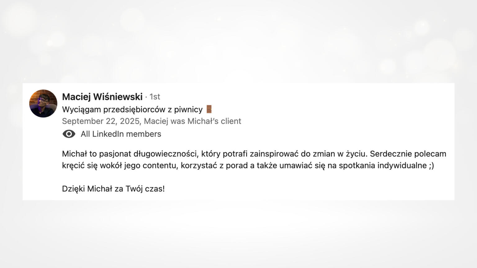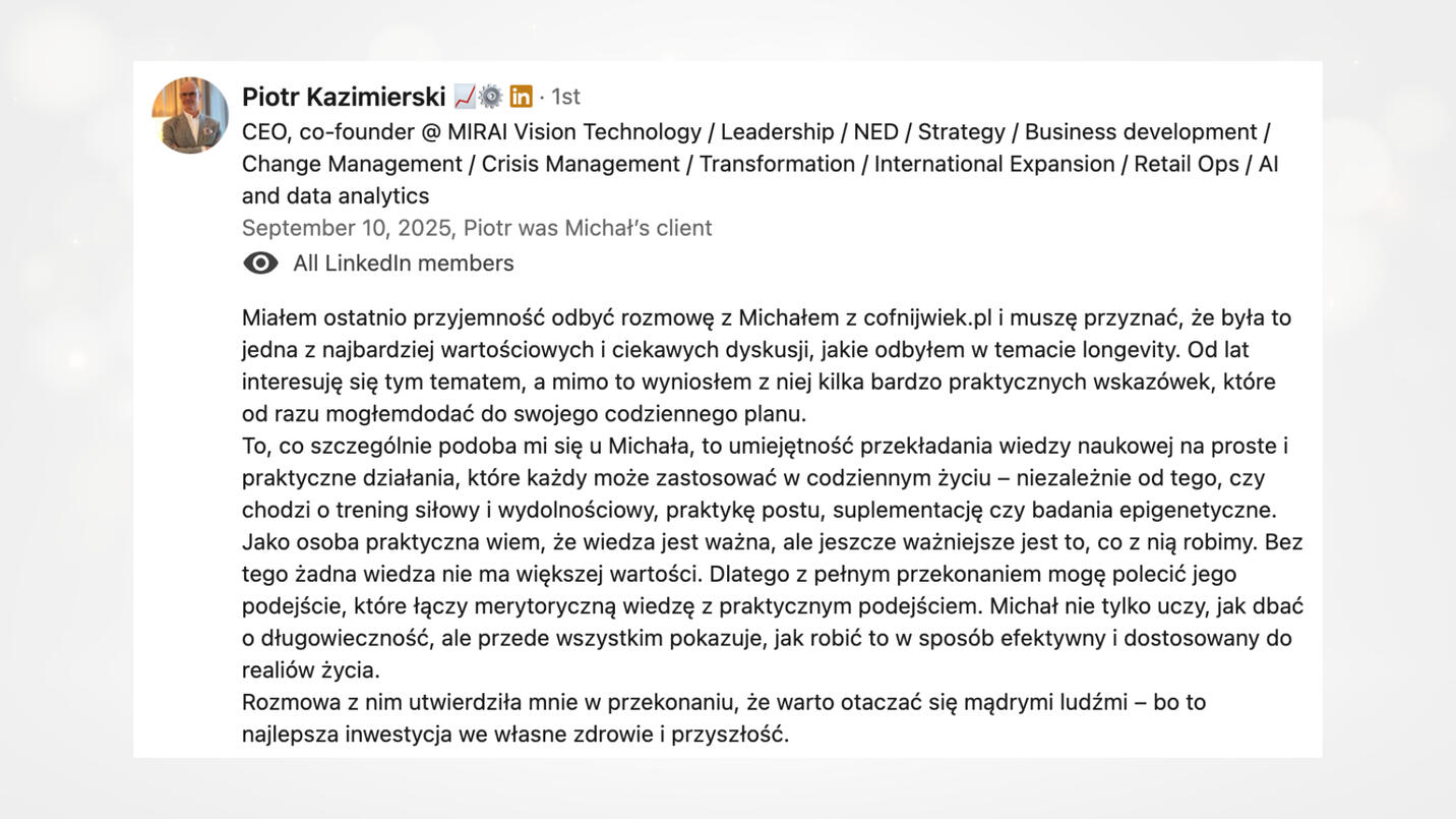 Jestem Michał Wieczorek, a mediach społecznościowych znajdziesz mnie jako Faceta od długowieczności.Moją pasję do długowieczności postanowiłem zamienić na sposób na życie. Jestem przedsiębiorcą, inwestorem, z wykształcenia magistrem inż. informatyki i finansistą, który od lat zgłębia naukę o długowieczności, analizując badania, protokoły i interwencje stosowane przez czołowych światowych ekspertów. Moje wyniki — biologiczny wiek 31 lat przy metrykalnych 39 oraz tempo starzenia wolniejsze niż u 97% populacji — potwierdzają skuteczność metod, które testuję na sobie.Wiedzę zdobywam w klinikach longevity i na międzynarodowych konferencjach, a następnie przekładam ją na praktyczne strategie dla innych. W mediach społecznościowych obserwuje mnie ponad 25 tys. osób, a podcast PROJEKT 100 gromadzi najlepszych gości z branży.
